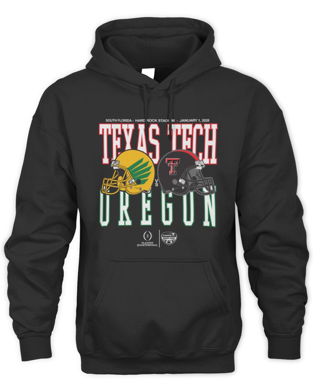 CFP Shop Capital One Orange Bowl 2026 Oregon vs Texas Tech Helmet Matchup Black Official Hoodie
