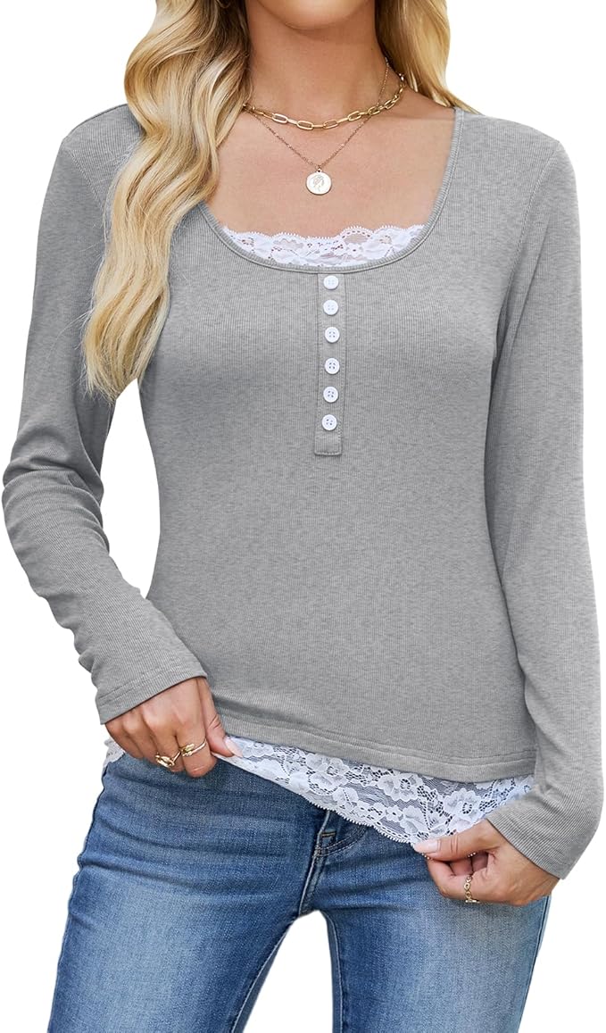 - ELEGANT DESIGN:Y2K-inspired lace tops for women feature a henley-style button detail and delicate lace trim on the neckline and hem. Perfect for streetwear women or college outfits seeking a chic, modern edge