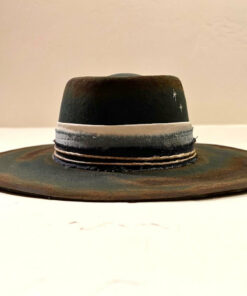 “Night Sky custom burned flat brim wool felt cowboy hat” is hand-distressed, hand-dyed, and hand-torched, ensuring no two share the same color or design. Each piece is uniquely imperfect, with subtle variations from product images.
