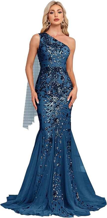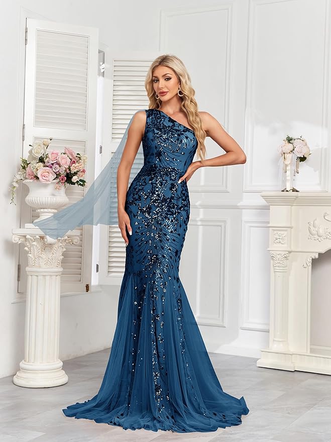 - Elegant Design: Exquisite one-shoulder mermaid gown with sequin beading and sleeveless design, perfect for formal evening events.