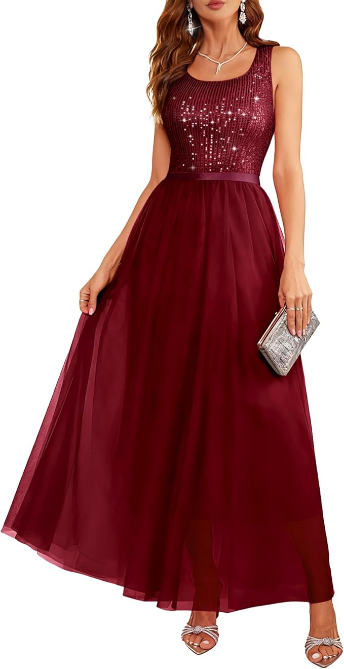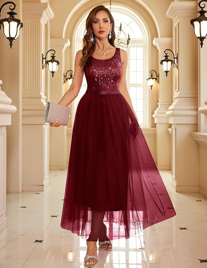 - The chic dress is designed with sparkling sequin top.Boat neck design shows your sexy clavicle. High waist design makes you in perfect body line.Floor length fluffy mesh dresses are the perfect way to hide excess belly fat.Keep this formal sequin dress with shiny necklace and simple high heels for a elegant look.